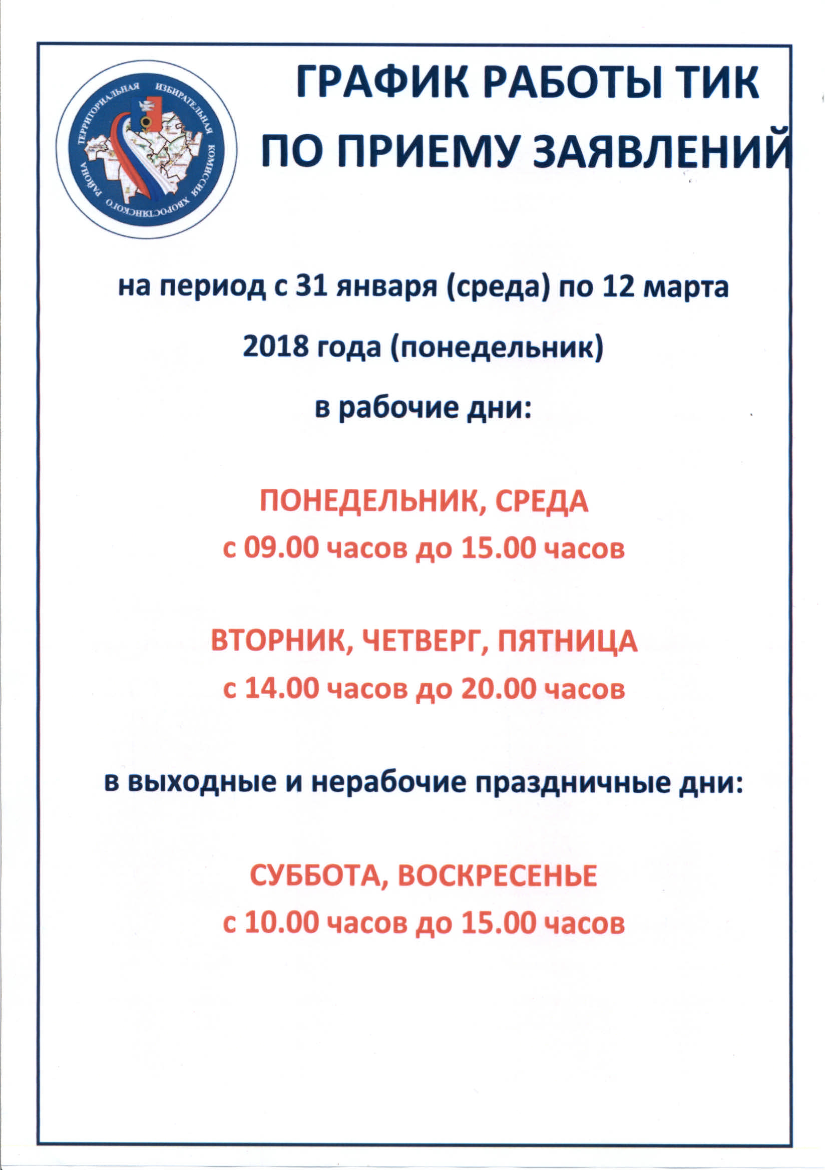 График работы ТИК на период с 31 января (среда)по 12 марта 2018 года (понедельник) |